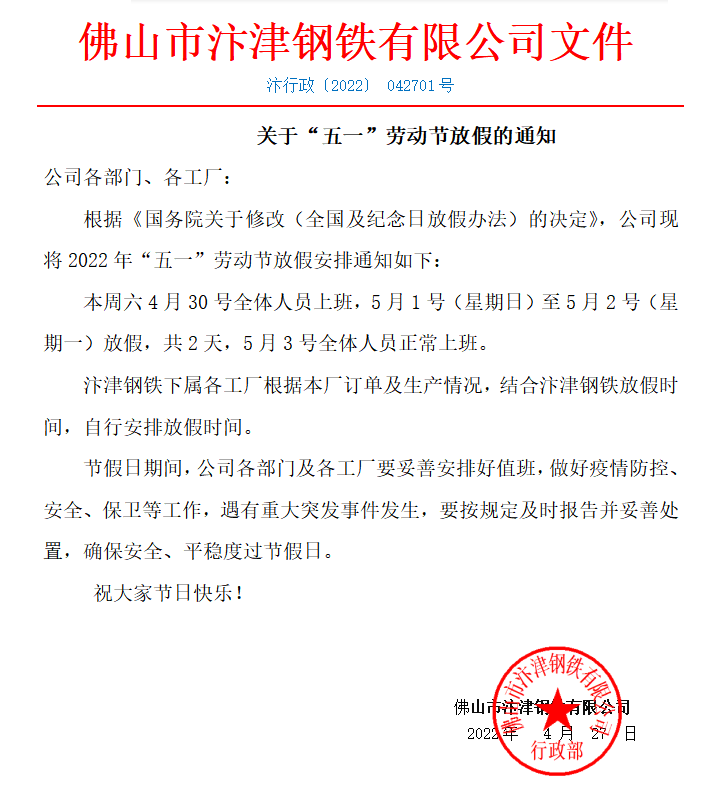 您当前的位置:中欧体育厂家 - 钢材世界 - 公司新闻 - 2022年汴津钢铁51劳动节放假通知