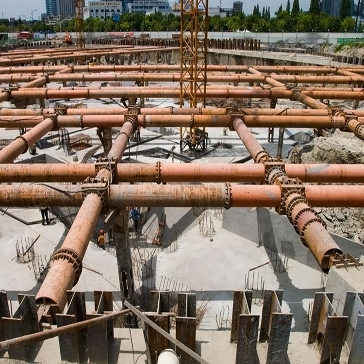 钢支撑指运用钢管、H型钢、角钢等增强工程结构的稳定性,一般情况是倾斜的连接构件,最常见的是人字形和交叉形状。目前钢支撑在地铁、基坑围护方面被广泛应用。因钢支撑可回收再利用,具有经济性、环保性等特征。