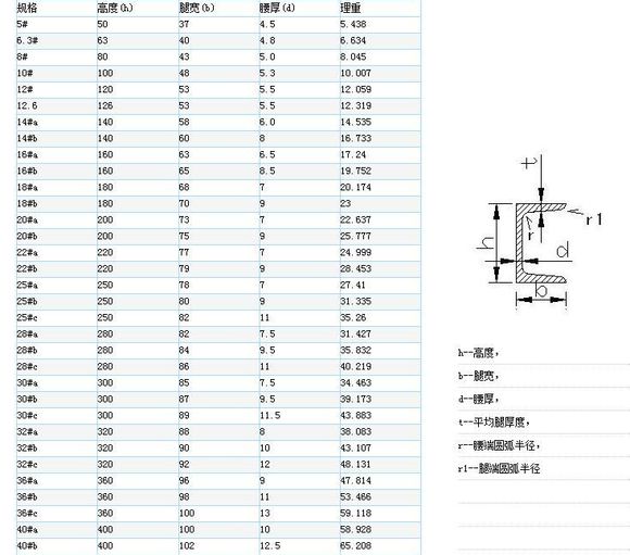 槽钢是截面为凹槽形的长条钢材。截面形状为槽形的型钢。槽钢属建造用和机械用碳素结构钢,是复杂断面的型钢钢材,其断面形状为凹槽形。槽钢主要用于建筑结构、幕墙工程、机械设备和车辆制造等。在使用中要求其具有较好的焊接、铆接性能及综合机械性能。 产槽钢的原料钢坯为含碳量不超过0.25%的碳结钢或低合金钢钢坯。成品槽钢经热加工成形、正火或热轧状态交货。其规格以腰高(h)*腿宽(b)*腰厚(d)的毫米数表示,如100*48*5.3,表示腰高为100毫米,腿宽为48毫米,腰厚为5.3毫米的槽钢,或称10#槽钢。腰高相同的槽钢,如有几种不同的腿宽和腰厚也需在型号右边加a b c 予以区别,如25#a 25#b 25#c等。槽钢分普通槽钢和轻型槽钢。热轧普通槽钢的规格为5-40#。经供需双方协议供应的热轧变通槽钢规格为6.5-30#。槽钢主要用于建筑结构、车辆制造、其它工业结构和固定盘柜等,槽钢还常常和工字钢配合使用。